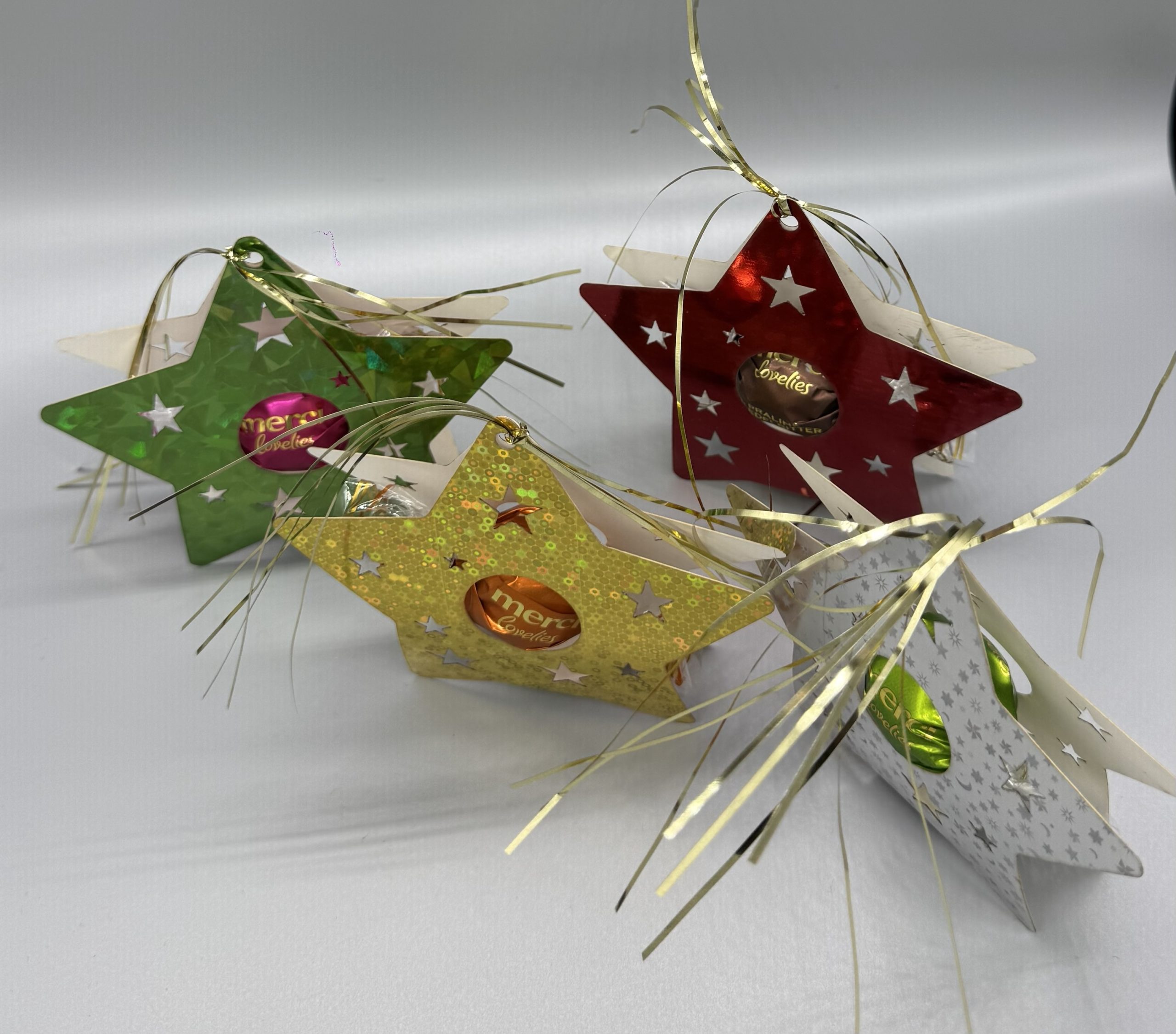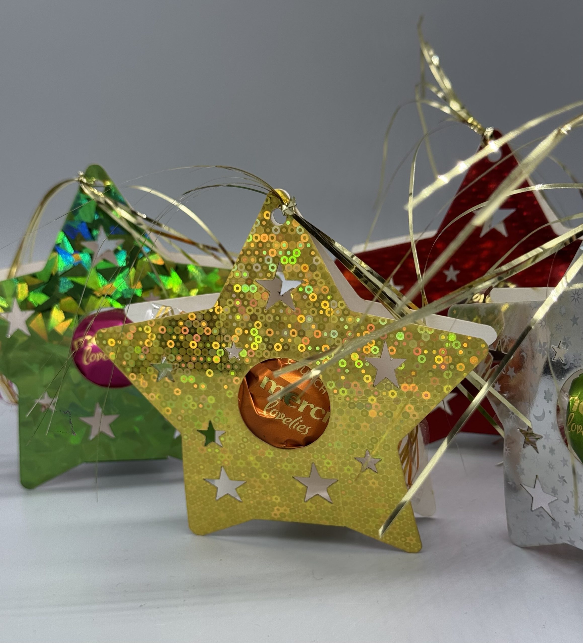 Jeder Stern ist aus glänzendem Hologramm-Papier gefertigt und bietet Platz für eine einzelne Praline – zum Beispiel Merci oder ähnliche Größen.