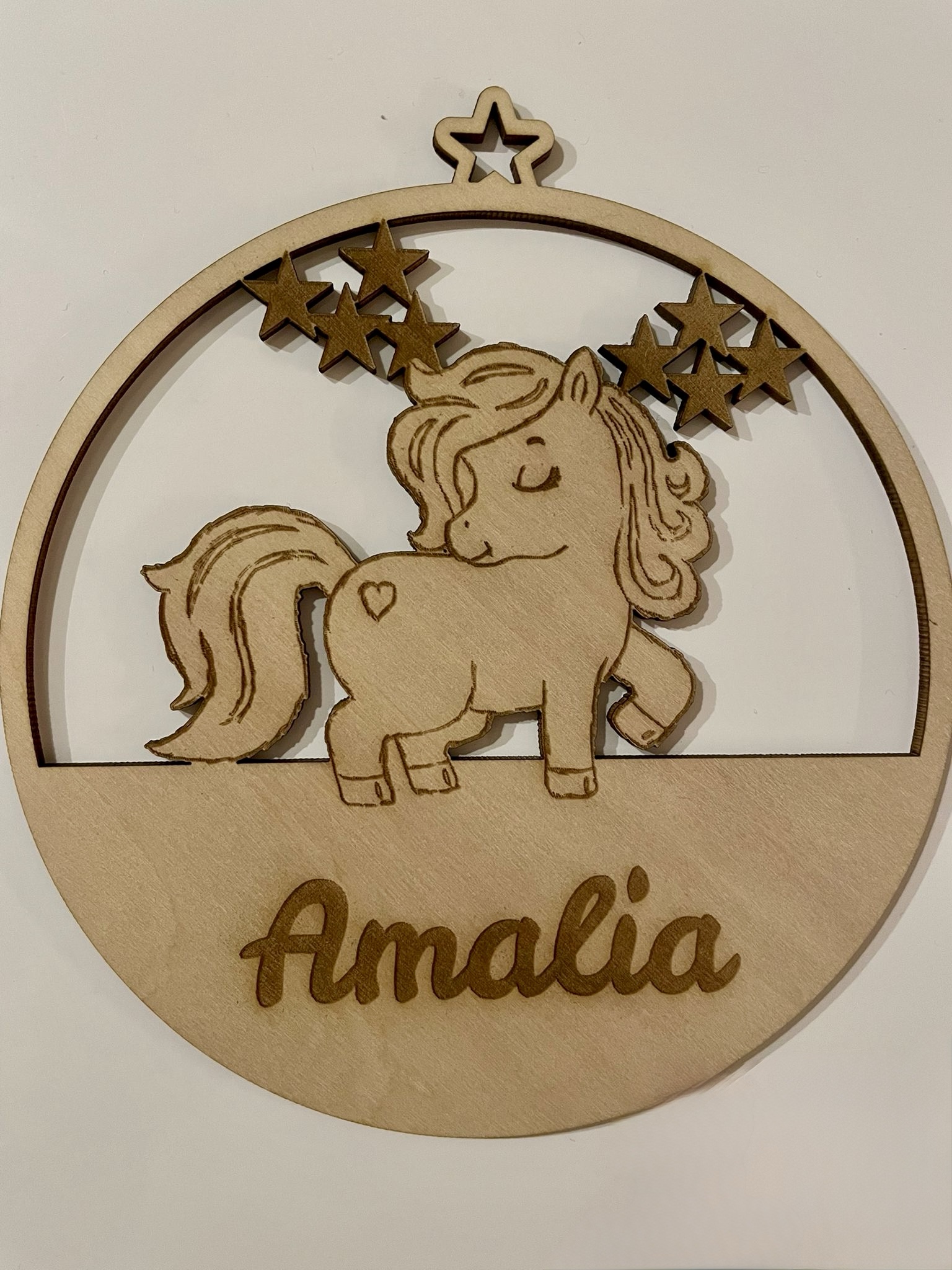 Das niedliche Pony mit den kleinen Sternen darüber bringt Wärme und Geborgenheit in jeden Raum – und dank des personalisierten Namens wird daraus ein echtes Unikat.